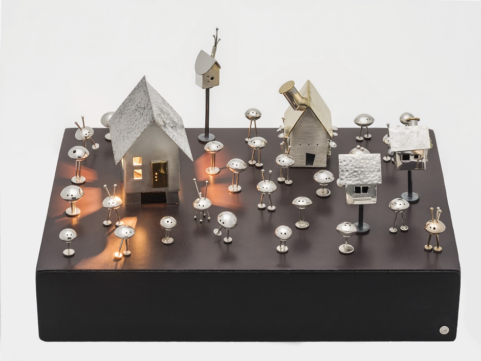 Vingt-cinq martiens, cinq maisons et un chien-2012-Sterling silver, brass, pearl, peridot and magnet, wood base-22 sur 15 sur 15 cm
